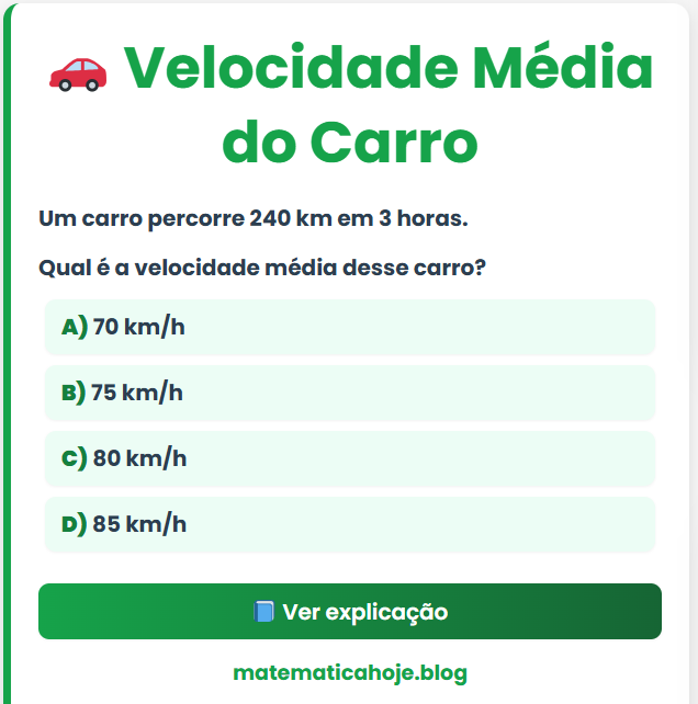 Continue lendoVelocidade Média do Carro 🚗 Velocidade Média do Carro Um carro percorre 240 km em 3 horas. Qual é a