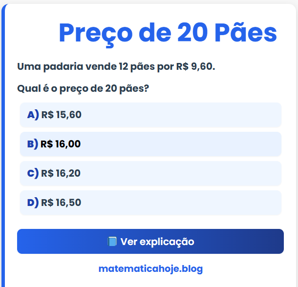 Continue lendoPreço de 20 Pães 🥖 Preço de 20 Pães Uma padaria vende 12 pães por R$ 9,60. Qual é o