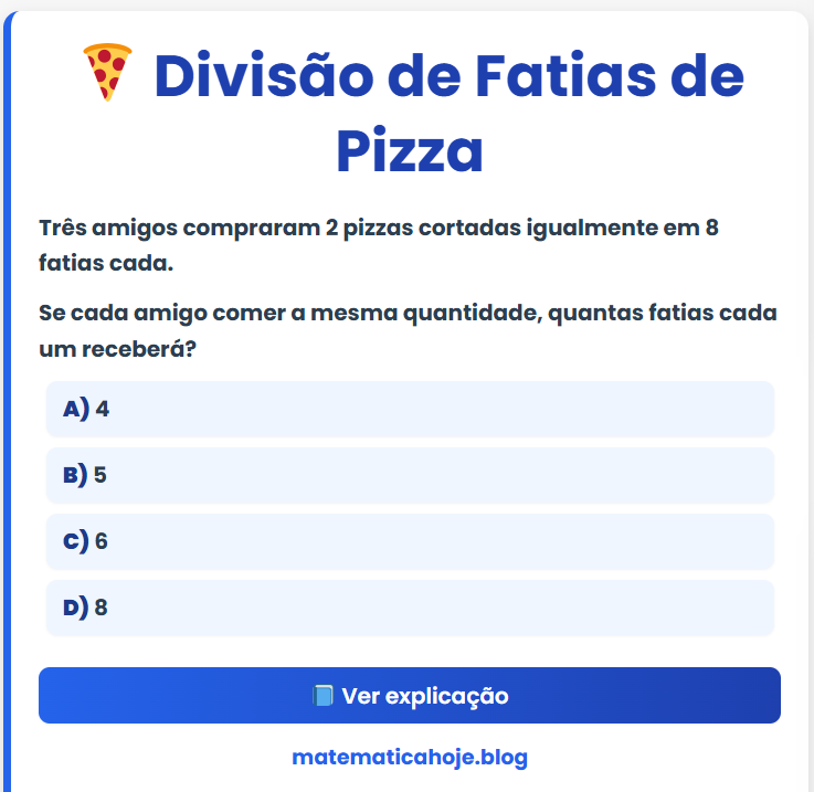 Continue lendo🍕 Divisão de Fatias de Pizza Três amigos compraram 2 pizzas cortadas igualmente em 8 fatias cada. Se cada amigo