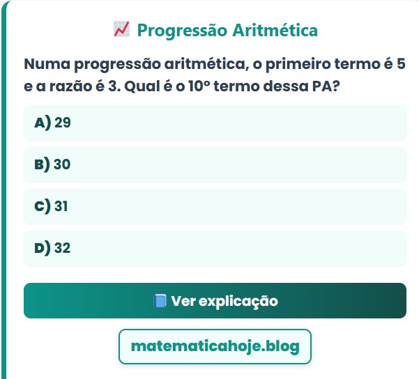 Continue lendo📈 Progressão Aritmética Numa progressão aritmética, o primeiro termo é 5 e a razão é 3. Qual é o 10º