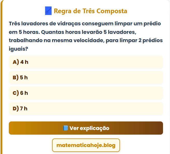 Continue lendo🧹 Regra de Três Composta Três lavadores de vidraças conseguem limpar um prédio em 5 horas. Quantas horas levarão 5