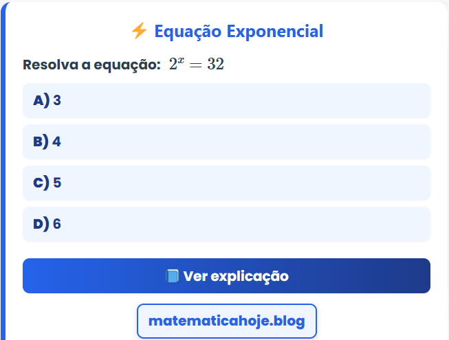 Continue lendo⚡ Equação Exponencial Resolva a equação: \(\;2^x = 32\) A) 3 B) 4 C) 5 D) 6 📘 Ver explicação