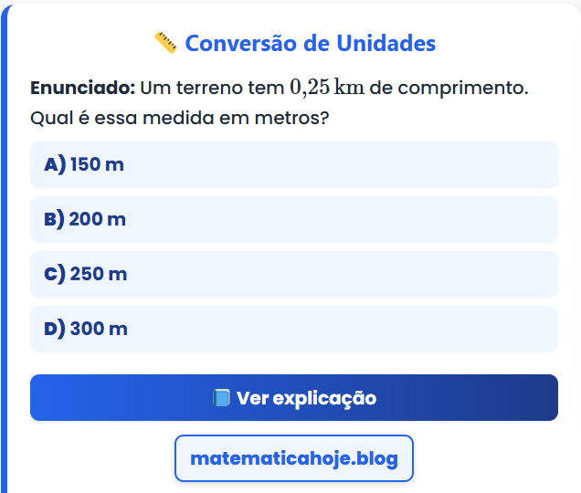 Continue lendo📏 Conversão de Unidades Enunciado: Um terreno tem \( 0{,}25 \,\text{km} \) de comprimento. Qual é essa medida em metros?