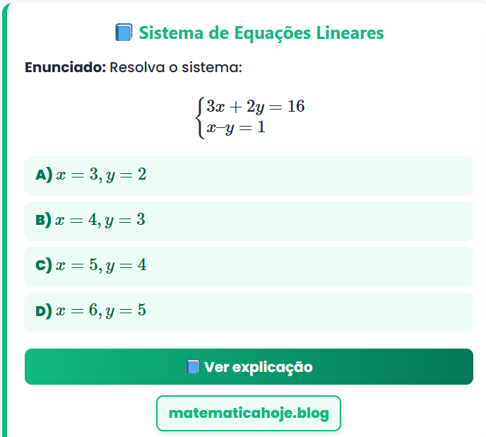 Continue lendo📘 Sistema de Equações Lineares Enunciado: Resolva o sistema: \[ \begin{cases} 3x + 2y = 16 \\ x – y