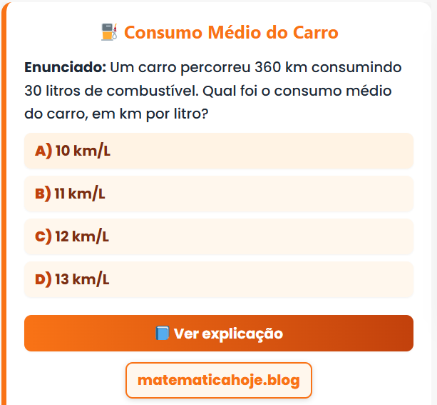 Continue lendo⛽ Consumo Médio do Carro Enunciado: Um carro percorreu 360 km consumindo 30 litros de combustível. Qual foi o consumo