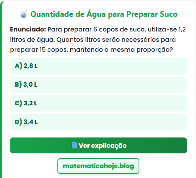 Continue lendo🥤 Quantidade de Água para Preparar Suco Enunciado: Para preparar 6 copos de suco, utiliza-se 1,2 litros de água. Quantos