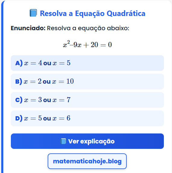 Continue lendo📘 Resolva a Equação Quadrática Enunciado: Resolva a equação abaixo: \[ x^2 – 9x + 20 = 0 \] A)