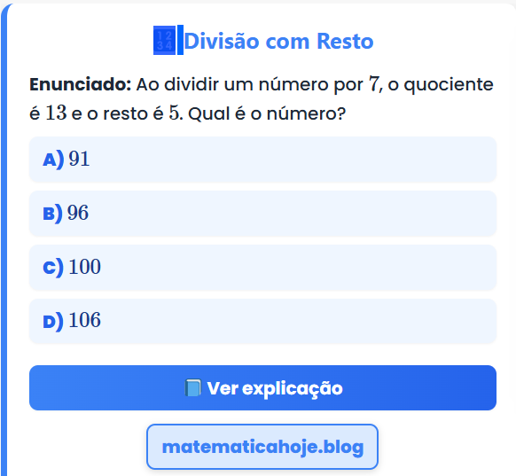 Continue lendo🔢 Divisão com Resto Enunciado: Ao dividir um número por \(7\), o quociente é \(13\) e o resto é \(5\).