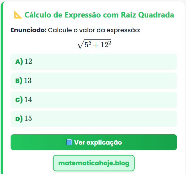 Continue lendo📐 Cálculo de Expressão com Raiz Quadrada Enunciado: Calcule o valor da expressão: \(\sqrt{5^2 + 12^2}\) A) \(12\) B) \(13\)