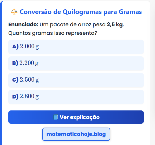 Continue lendo⚖️ Conversão de Quilogramas para Gramas Enunciado: Um pacote de arroz pesa 2,5 kg. Quantos gramas isso representa? A) \(2.000\,\text{g}\)