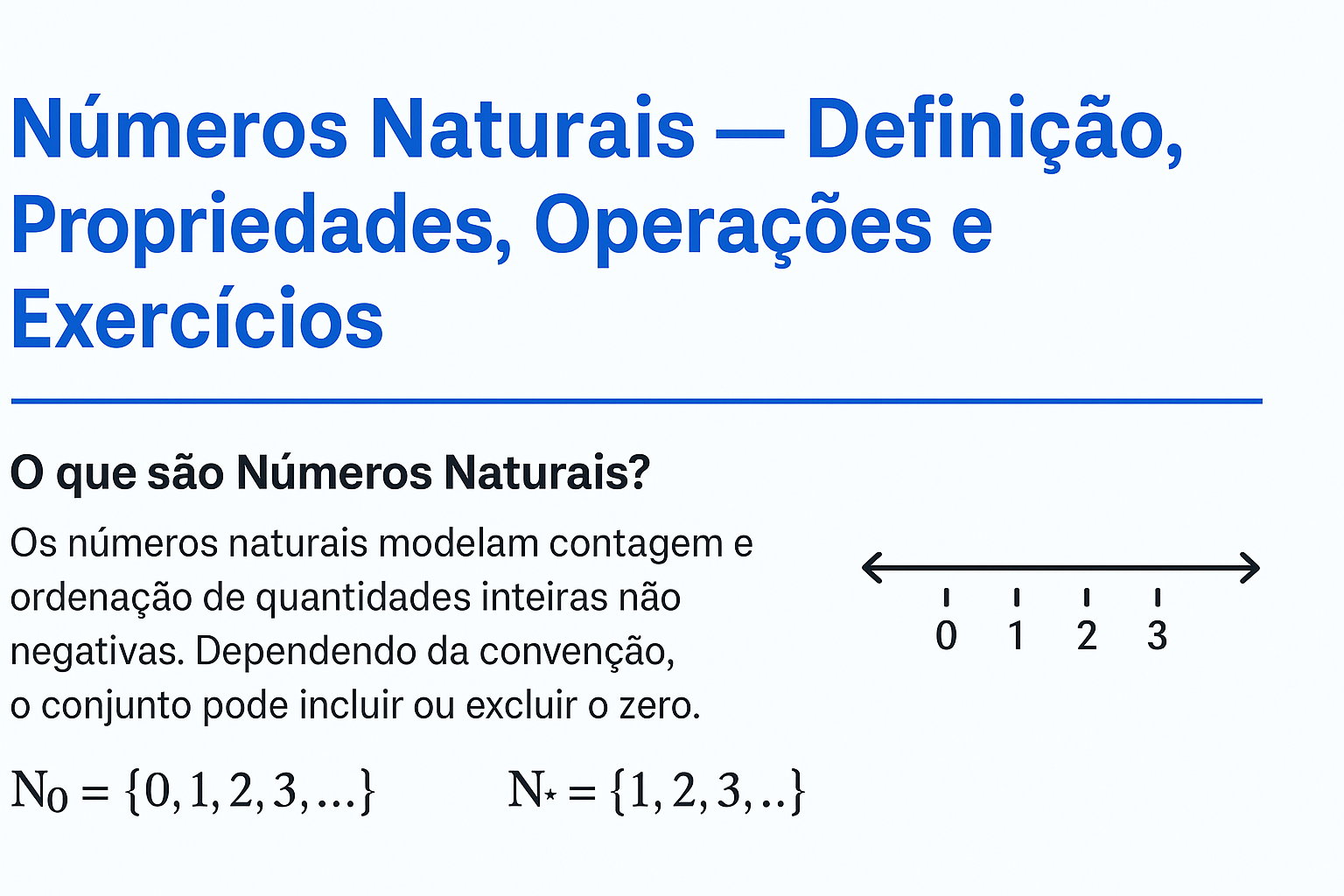 Continue lendoNúmeros Naturais: Definição, Propriedades, Operações e Exercícios Resolvidos Números Naturais — Definição, Propriedades, Operações e Exercícios Atualizado em 22 de