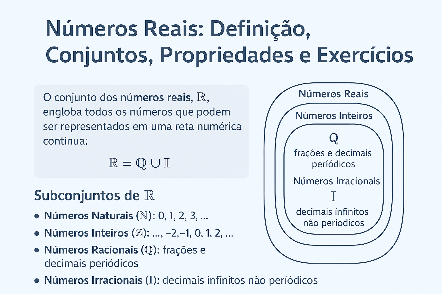 Continue lendoNúmeros Reais: Definição, Conjuntos, Propriedades, Representação e Exercícios Números Reais — Definição, Conjuntos, Propriedades e Exercícios Atualizado em 22 de
