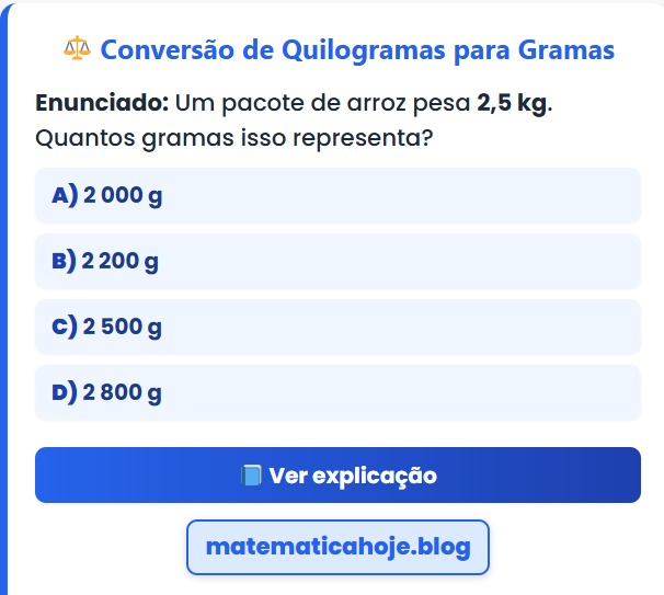 Continue lendo⚖️ Conversão de Quilogramas para Gramas Enunciado: Um pacote de arroz pesa 2,5 kg. Quantos gramas isso representa? A) 2
