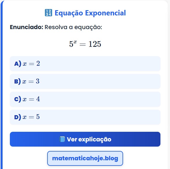 Continue lendo🔢 Equação Exponencial Enunciado: Resolva a equação: \[ 5^x = 125 \] A) \(x = 2\) B) \(x = 3\)