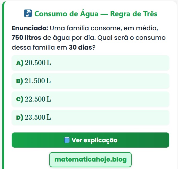 Continue lendo🚰 Consumo de Água — Regra de Três Enunciado: Uma família consome, em média, 750 litros de água por dia.
