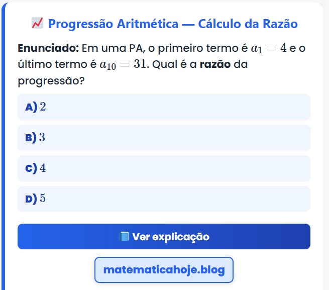 📈 Progressão Aritmética — Cálculo da Razão Enunciado: Em uma PA, o primeiro termo é \(a_1 = 4\) e o