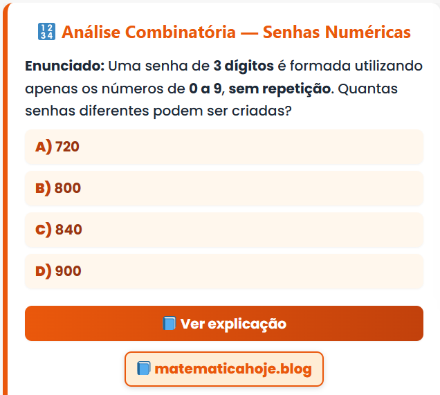 Continue lendo🔢 Análise Combinatória — Senhas Numéricas Enunciado: Uma senha de 3 dígitos é formada utilizando apenas os números de 0