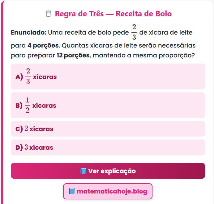 Continue lendo🥛 Regra de Três — Receita de Bolo Enunciado: Uma receita de bolo pede \(\dfrac{2}{3}\) de xícara de leite para