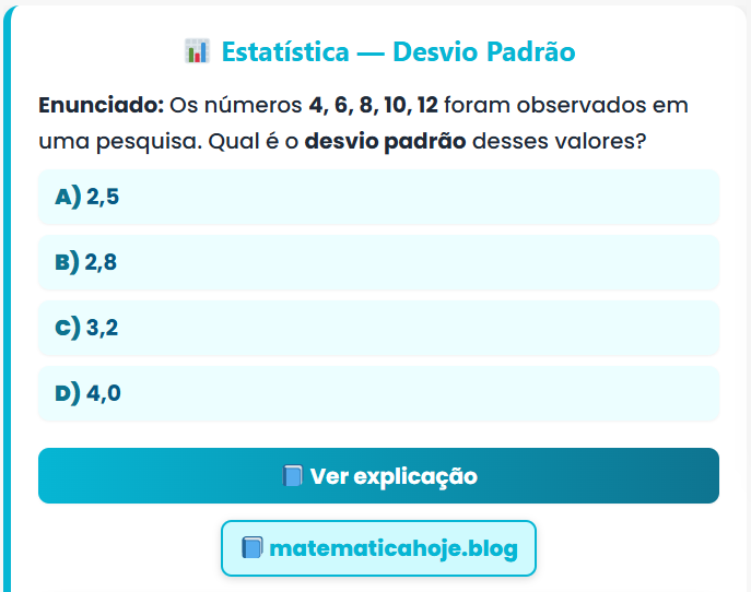 Continue lendo📊 Estatística — Desvio Padrão Enunciado: Os números 4, 6, 8, 10, 12 foram observados em uma pesquisa. Qual é