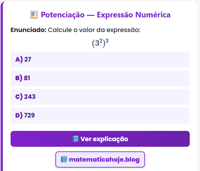 Continue lendo🧮 Potenciação — Expressão Numérica Enunciado: Calcule o valor da expressão: \((3^2)^3\) A) 27 B) 81 C) 243 D) 729