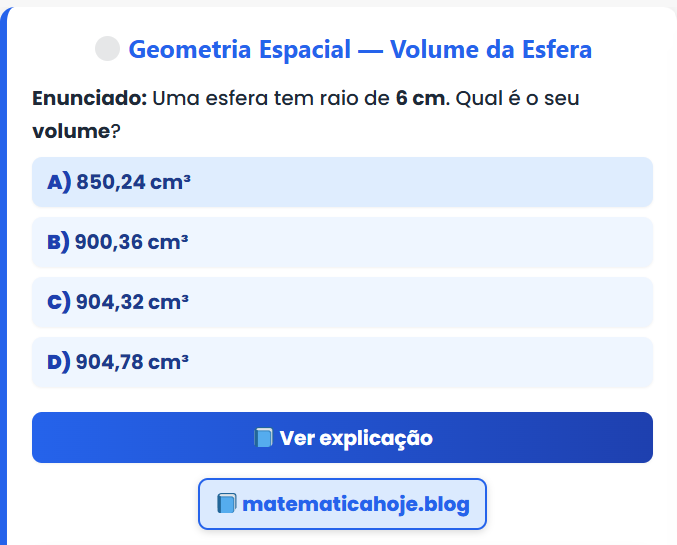 Continue lendo⚪ Geometria Espacial — Volume da Esfera Enunciado: Uma esfera tem raio de 6 cm. Qual é o seu volume?