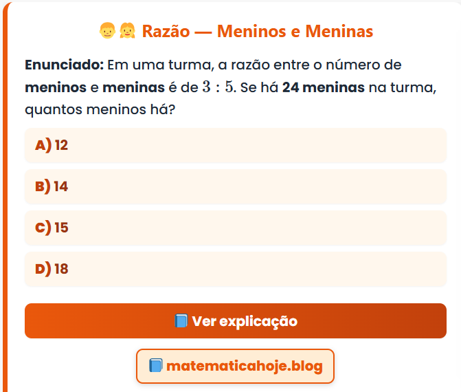 Continue lendo👦👧 Razão — Meninos e Meninas Enunciado: Em uma turma, a razão entre o número de meninos e meninas é