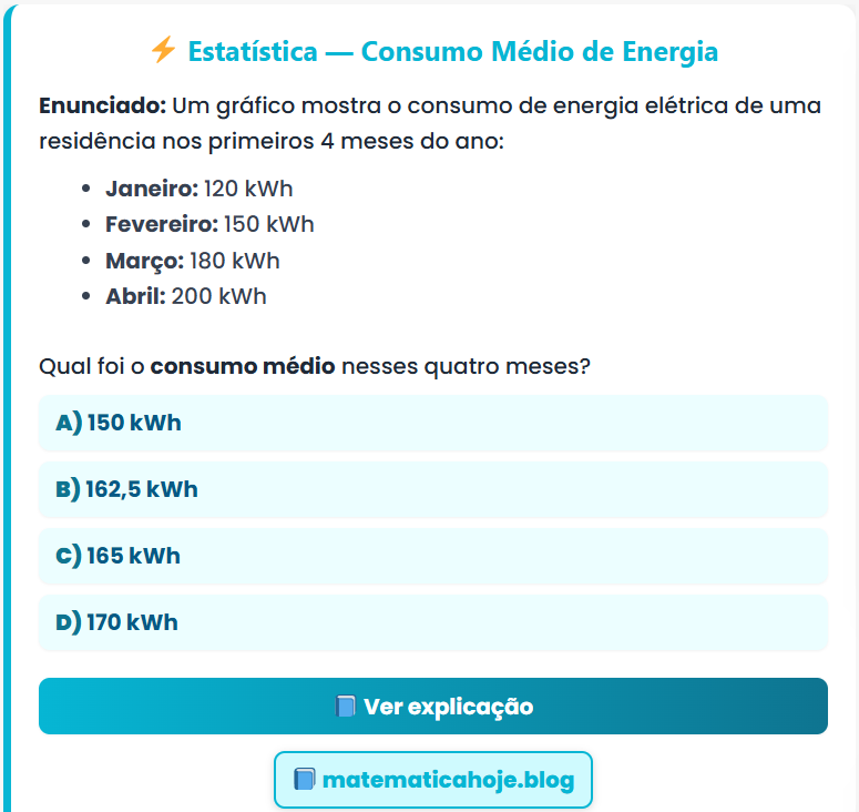 ⚡ Estatística — Consumo Médio de Energia Enunciado: Um gráfico mostra o consumo de energia elétrica de uma residência nos