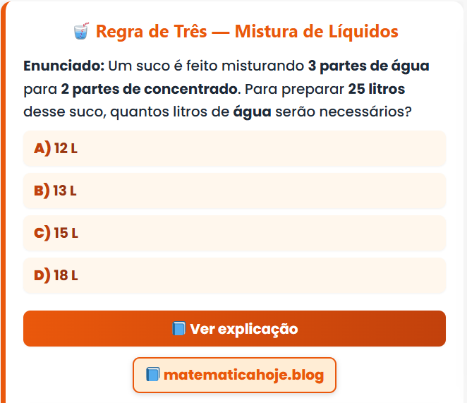 Continue lendo🥤 Regra de Três — Mistura de Líquidos Enunciado: Um suco é feito misturando 3 partes de água para 2