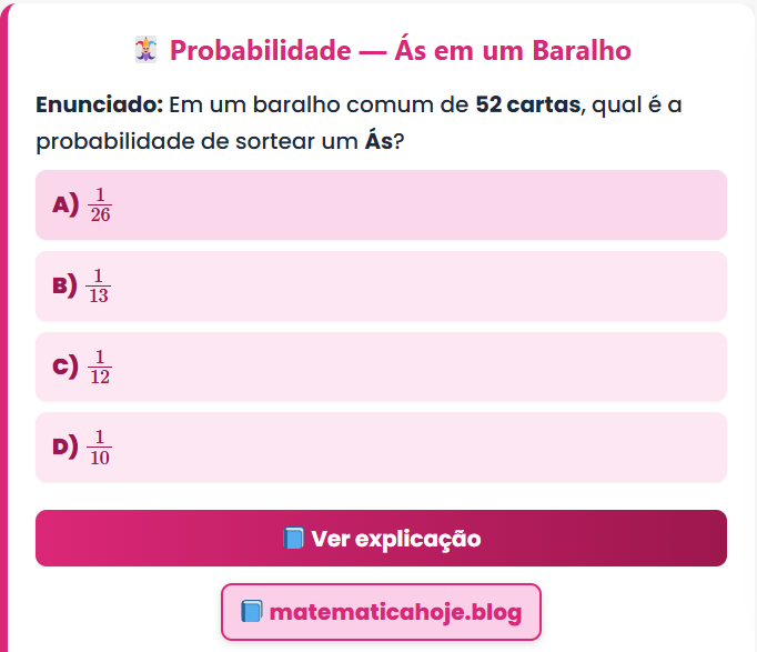 Continue lendo🃏 Probabilidade — Ás em um Baralho Enunciado: Em um baralho comum de 52 cartas, qual é a probabilidade de