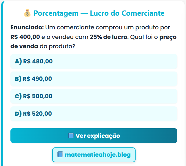 Continue lendo💰 Porcentagem — Lucro do Comerciante Enunciado: Um comerciante comprou um produto por R$ 400,00 e o vendeu com 25%