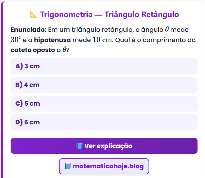 Continue lendo📐 Trigonometria — Triângulo Retângulo Enunciado: Em um triângulo retângulo, o ângulo \( \theta \) mede \(30^\circ\) e a hipotenusa