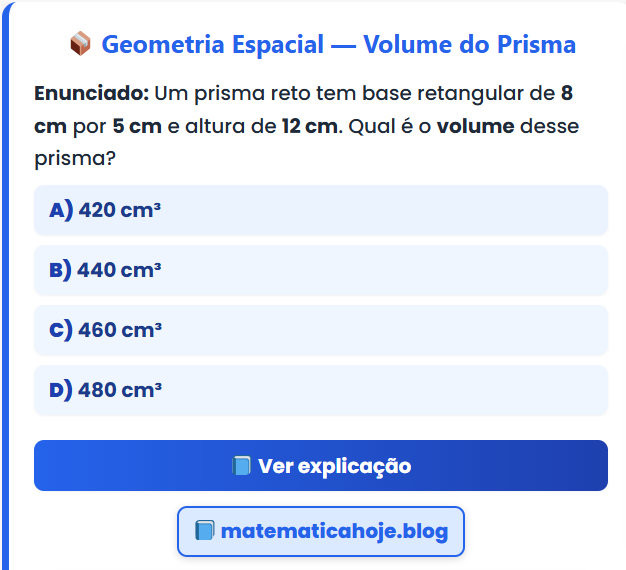 Continue lendo📦 Geometria Espacial — Volume do Prisma Enunciado: Um prisma reto tem base retangular de 8 cm por 5 cm