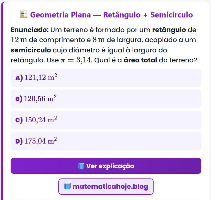 Continue lendo🧮 Geometria Plana — Retângulo + Semicírculo Enunciado: Um terreno é formado por um retângulo de \(12\,\text{m}\) de comprimento e
