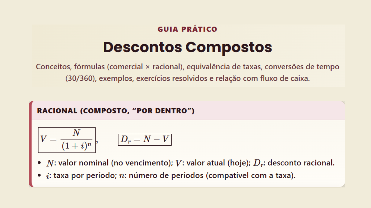 Guia prático Descontos Compostos Conceitos, fórmulas (comercial × racional), equivalência de taxas, conversões de tempo (30/360), exemplos, exercícios resolvidos e