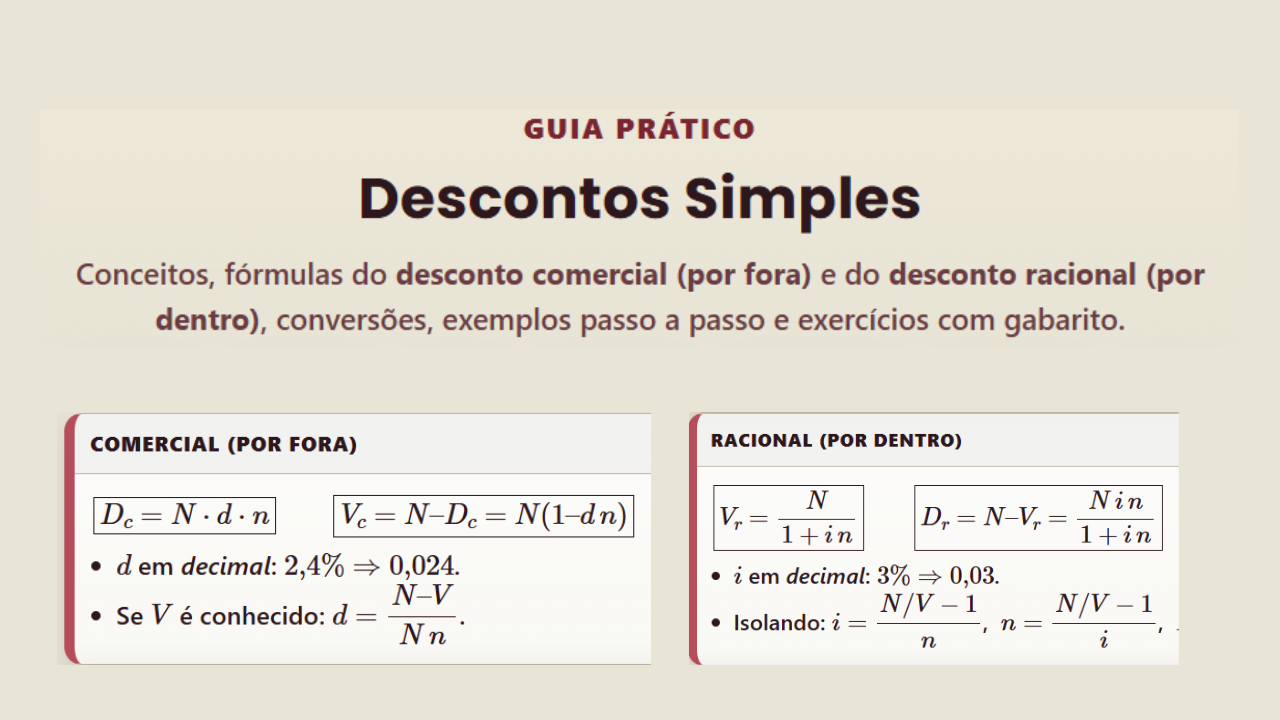 Continue lendoGuia prático Descontos Simples Conceitos, fórmulas do desconto comercial (por fora) e do desconto racional (por dentro), conversões, exemplos passo