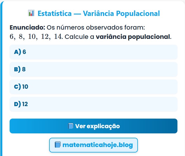 Continue lendo📊 Estatística — Variância Populacional Enunciado: Os números observados foram: \(6,\ 8,\ 10,\ 12,\ 14\). Calcule a variância populacional. A)