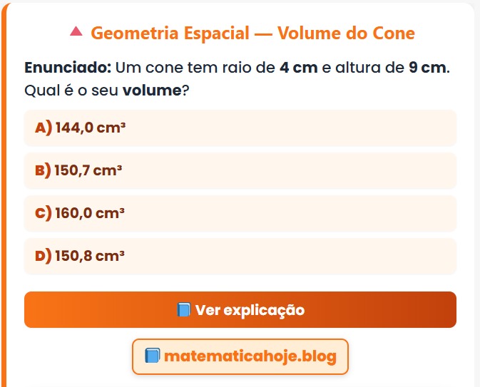Continue lendo🔺 Geometria Espacial — Volume do Cone Enunciado: Um cone tem raio de 4 cm e altura de 9 cm.