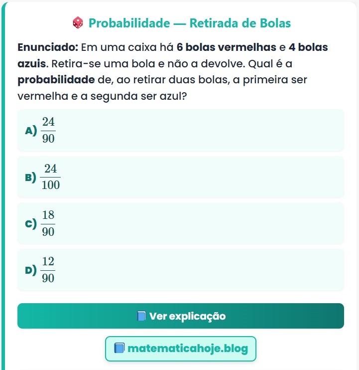 Continue lendo🎲 Probabilidade — Retirada de Bolas Enunciado: Em uma caixa há 6 bolas vermelhas e 4 bolas azuis. Retira-se uma