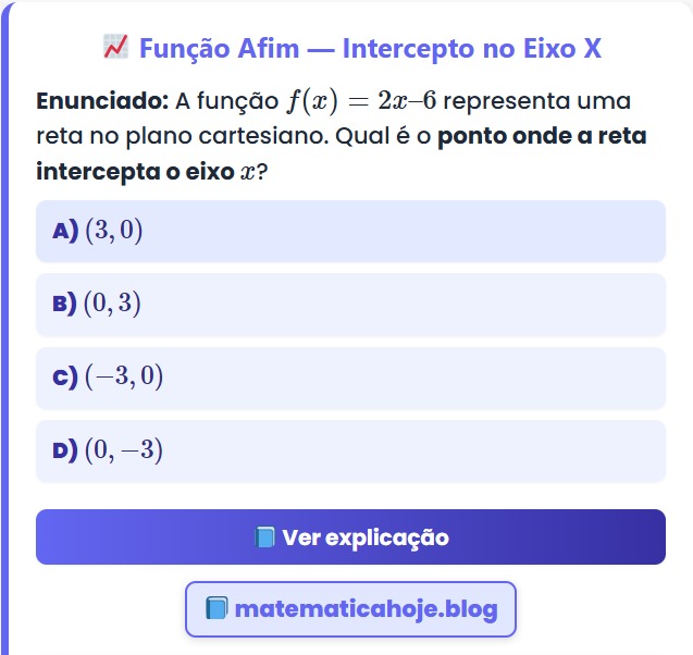 Continue lendo📈 Função Afim — Intercepto no Eixo X Enunciado: A função \(f(x) = 2x – 6\) representa uma reta no