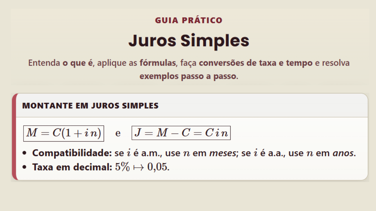 Continue lendoGuia prático Juros Simples Entenda o que é, aplique as fórmulas, faça conversões de taxa e tempo e resolva exemplos