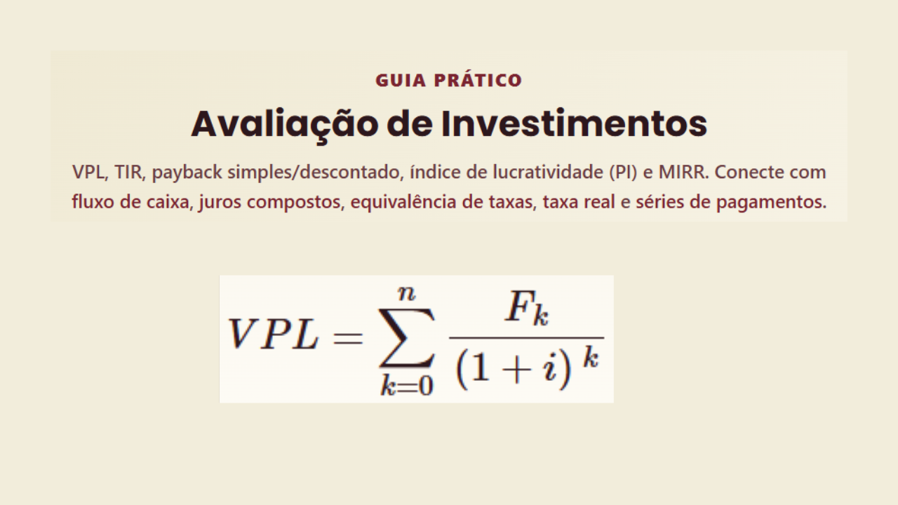 Continue lendoGuia prático Avaliação de Investimentos VPL, TIR, payback simples/descontado, índice de lucratividade (PI) e MIRR. Conecte com fluxo de caixa,