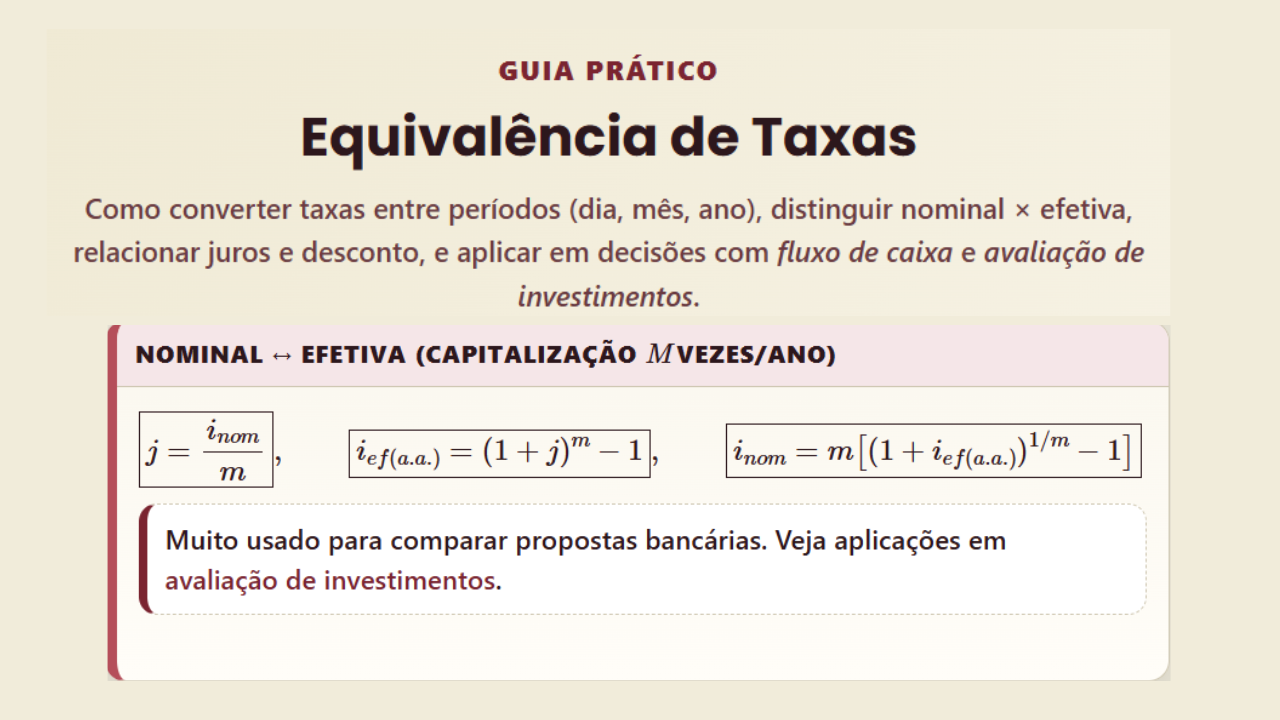 Continue lendoGuia prático Equivalência de Taxas Como converter taxas entre períodos (dia, mês, ano), distinguir nominal × efetiva, relacionar juros e
