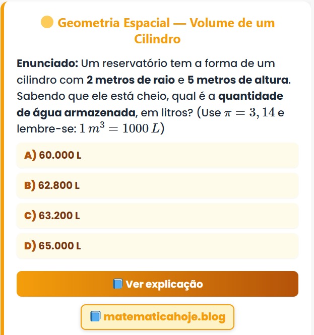 Continue lendo🟡 Geometria Espacial — Volume de um Cilindro Enunciado: Um reservatório tem a forma de um cilindro com 2 metros