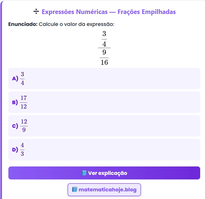 Continue lendo➗ Expressões Numéricas — Frações Empilhadas Enunciado: Calcule o valor da expressão: \( \dfrac{\dfrac{3}{4}}{\dfrac{9}{16}} \) A) \(\dfrac{3}{4}\) B) \(\dfrac{17}{12}\) C)