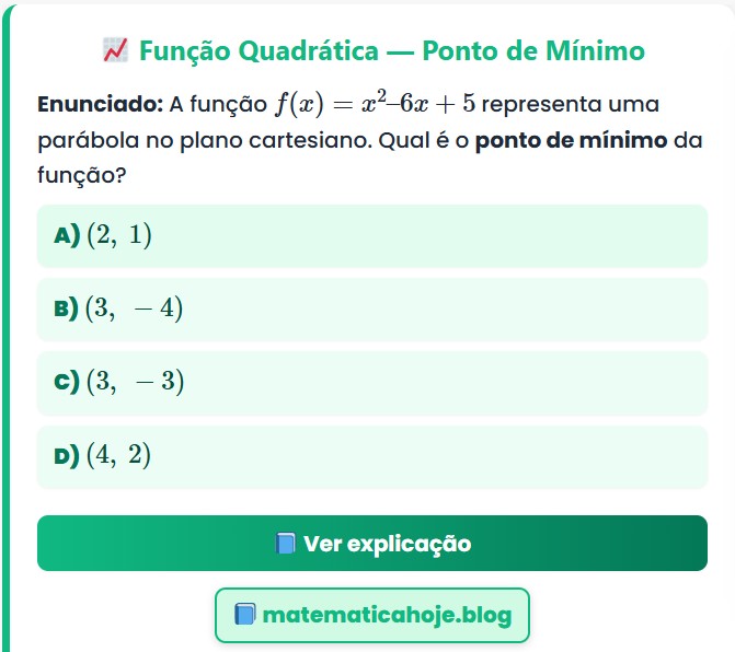 Continue lendo📈 Função Quadrática — Ponto de Mínimo Enunciado: A função \(f(x) = x^2 – 6x + 5\) representa uma parábola