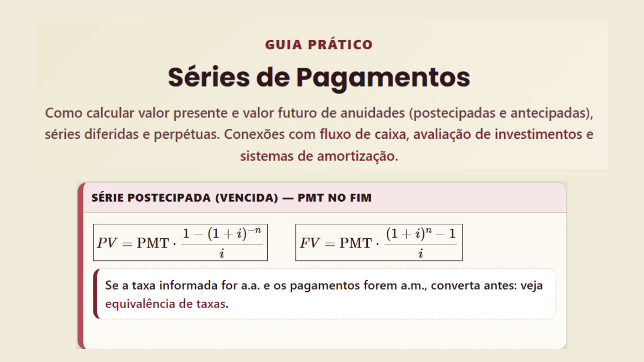 Continue lendoGuia prático Séries de Pagamentos Como calcular valor presente e valor futuro de anuidades (postecipadas e antecipadas), séries diferidas e
