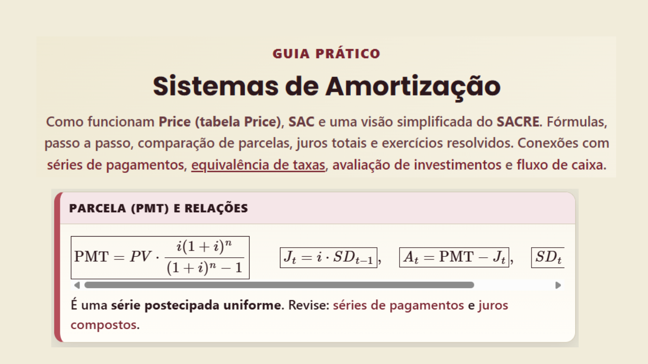 Continue lendoGuia prático Sistemas de Amortização Como funcionam Price (tabela Price), SAC e uma visão simplificada do SACRE. Fórmulas, passo a