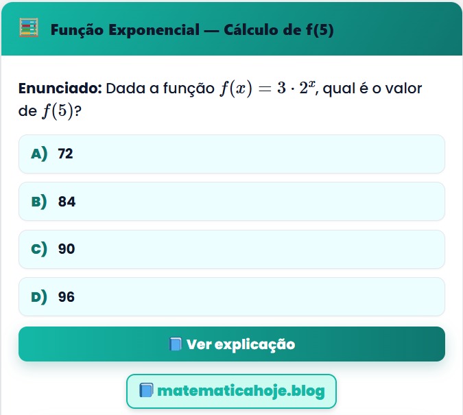 Continue lendo🧮 Função Exponencial — Cálculo de f(5) Enunciado: Dada a função \(f(x) = 3 \cdot 2^x\), qual é o valor