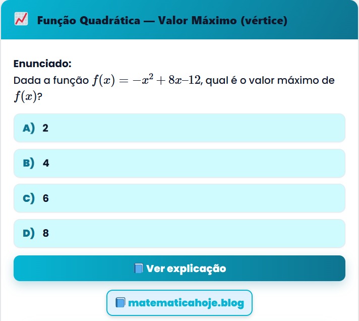 Continue lendo📈 Função Quadrática — Valor Máximo (vértice) Enunciado: Dada a função \(f(x) = -x^2 + 8x – 12\), qual é