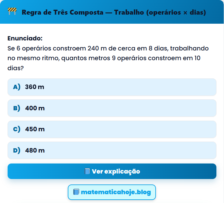 Continue lendo🚧 Regra de Três Composta — Trabalho (operários × dias) Enunciado: Se 6 operários constroem 240 m de cerca em
